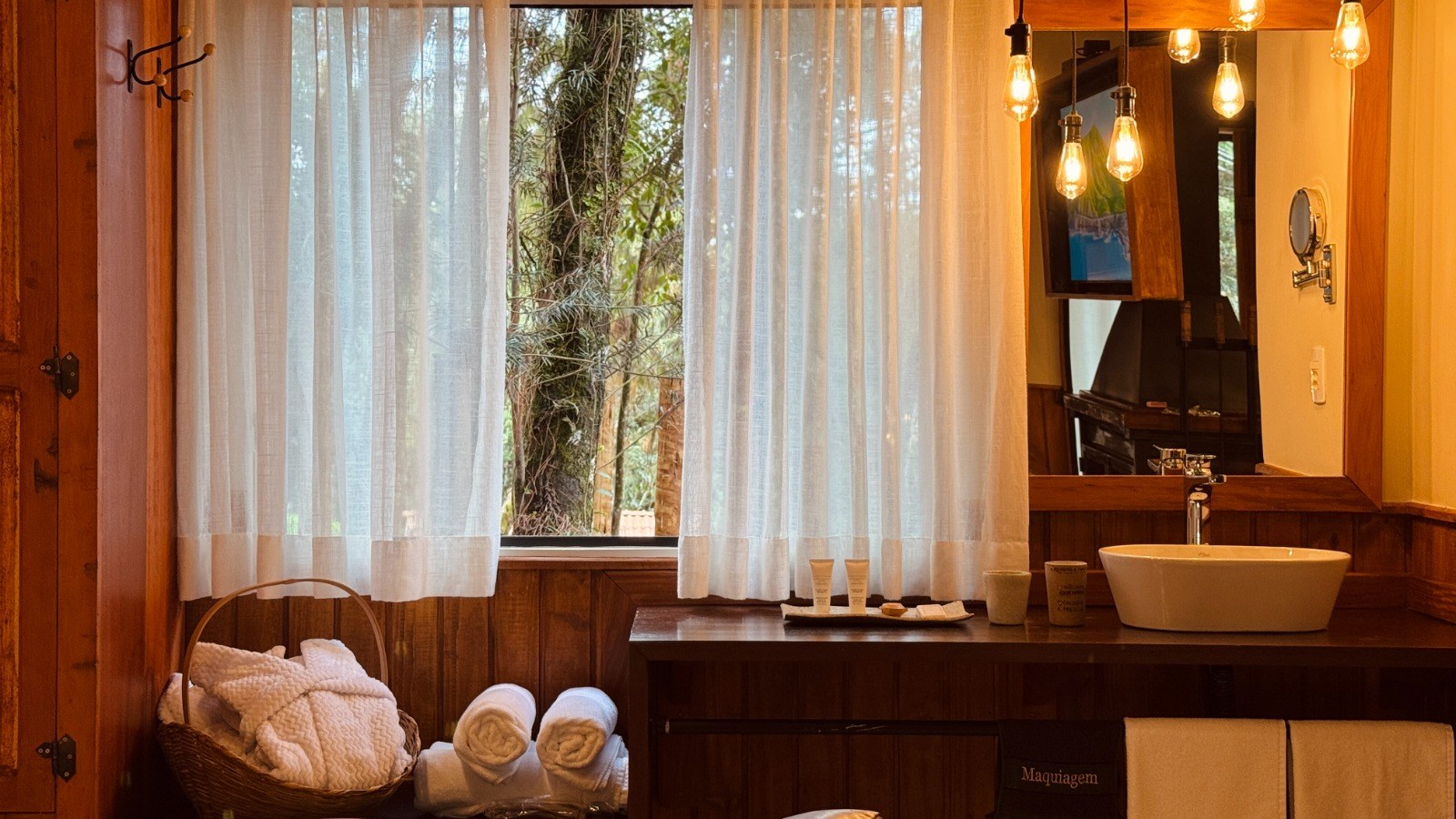 - Toalheiro elétrico, roupões e roupa de cama e banho completas.