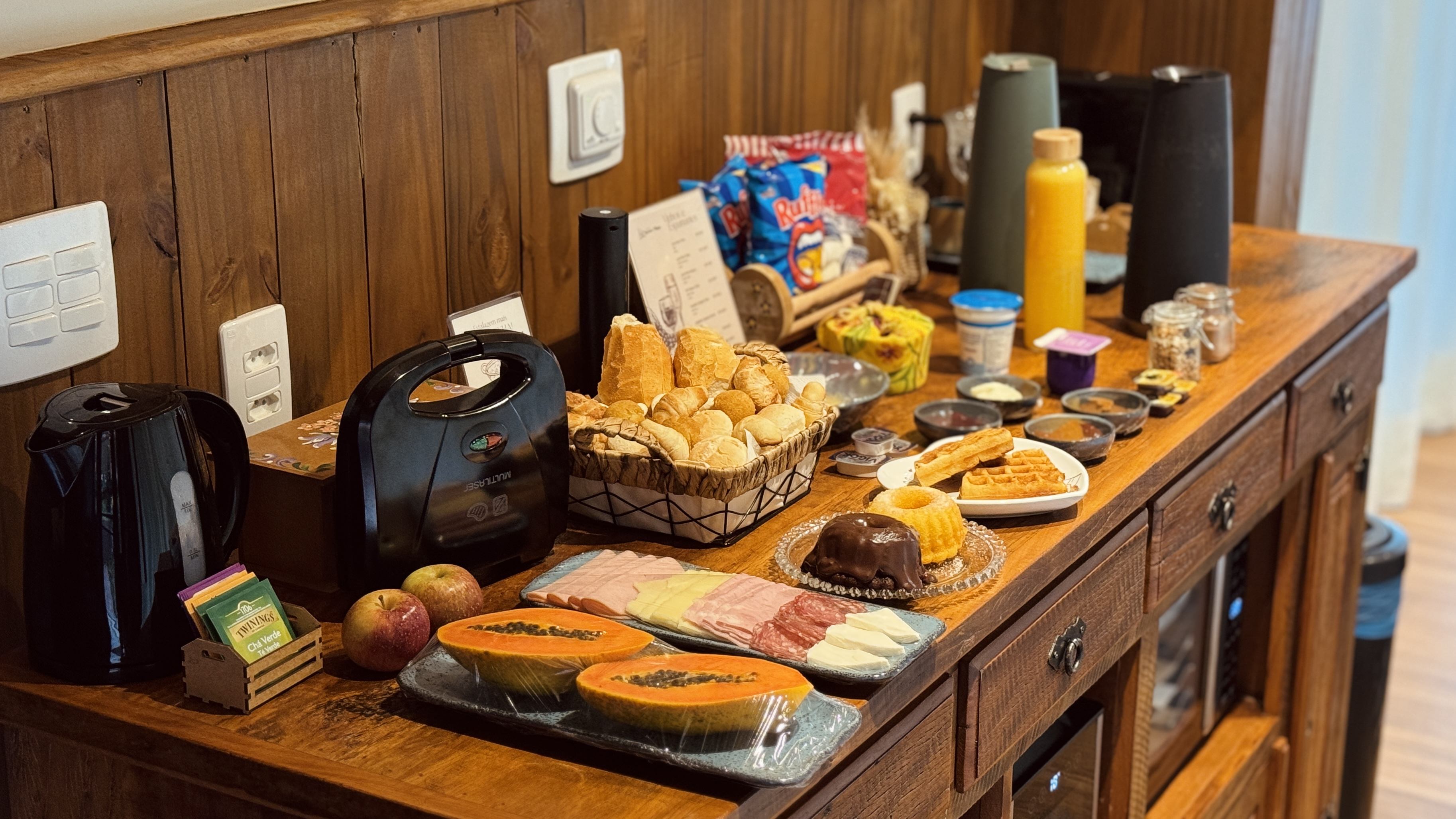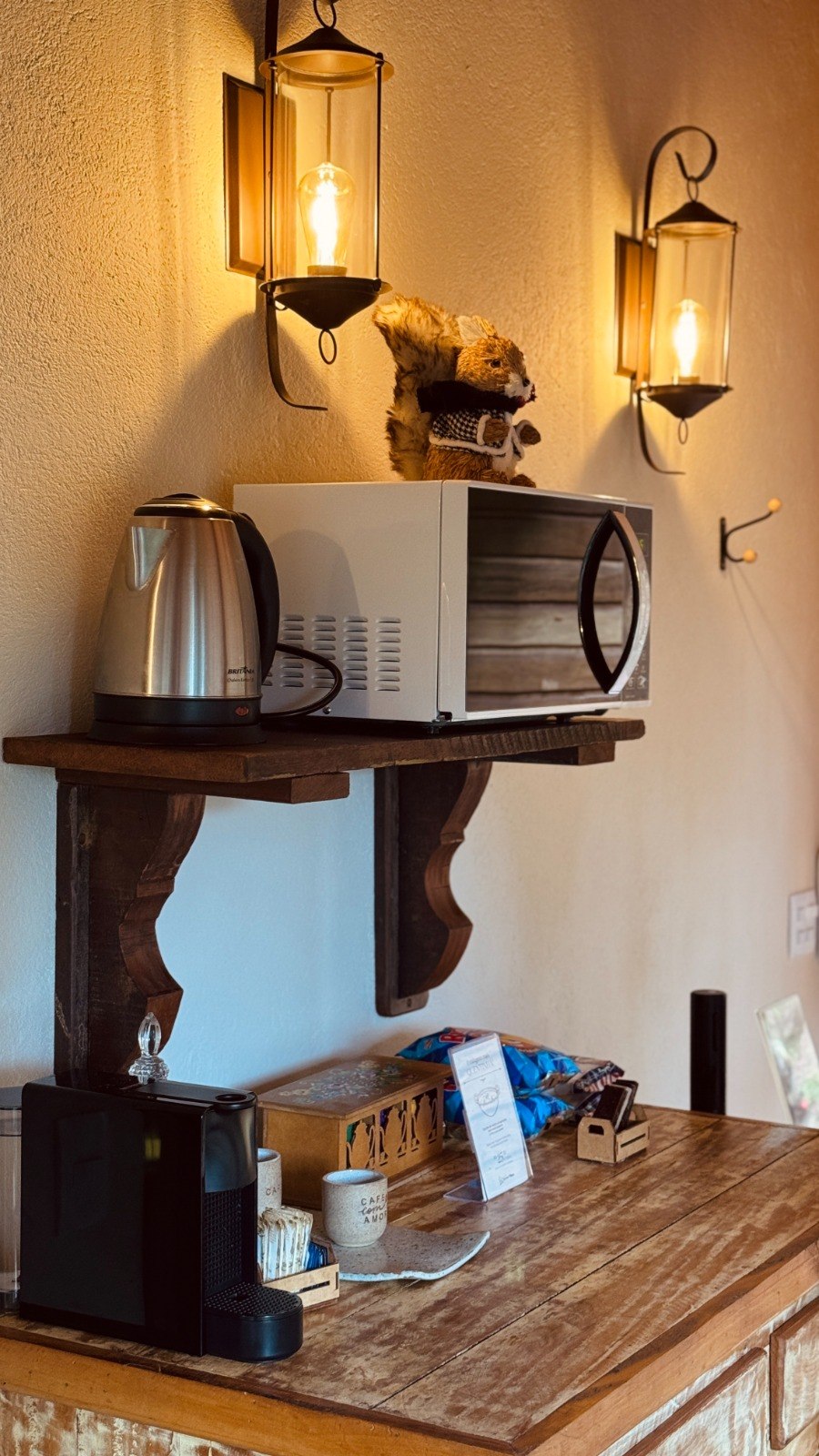 - Cafereira Nespresso, chaleira elétrica e utensílios para refeições rápidas